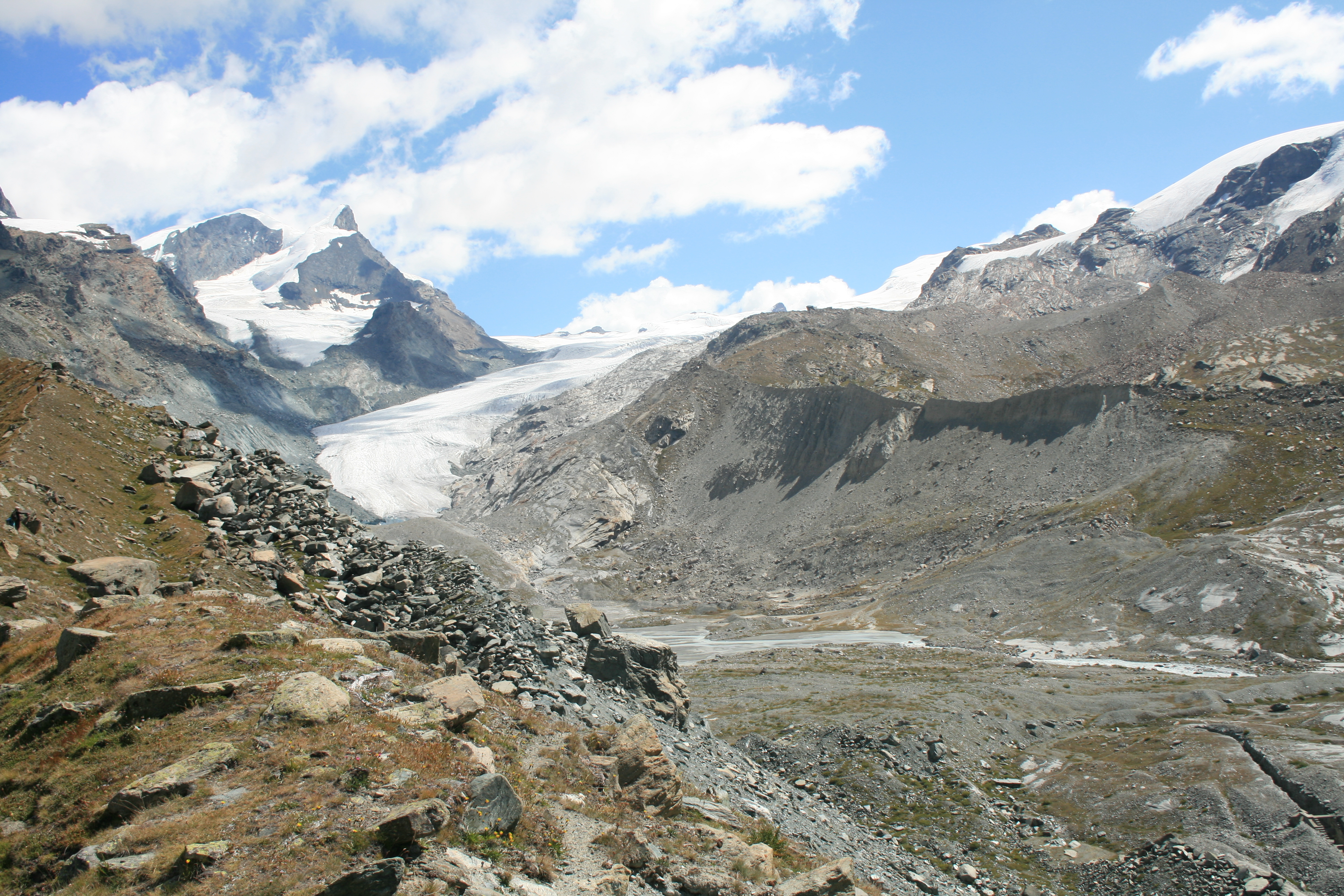 Last Sunday I was in Zermatt with my Girlfriend. We wanted to go on a hike before visiting friends we had there. During the hike we realised how bad the glacier melt has effected Zermatt. Following I'll share two pictures with you guys that I took wih my camera. You can see how far back the glacier has gone back and the landmass is crumbeling and hiking routes are falling apart.