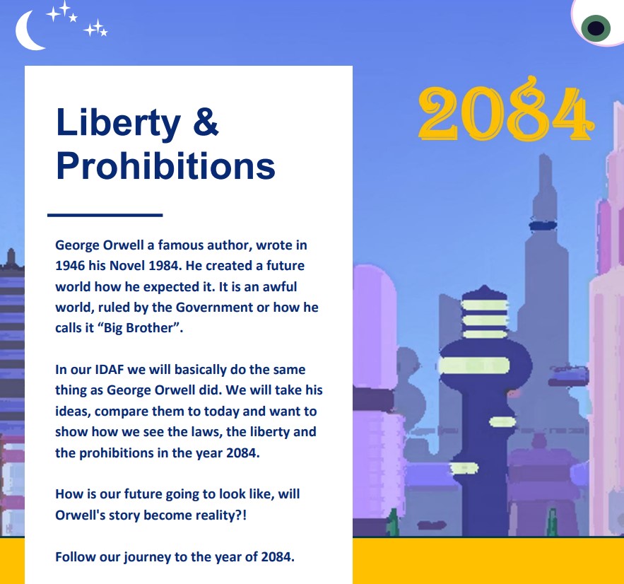 We are going to compare George Orwell’s book “1984” to todays life and do the same as George Orwell. We will write down our imaginations of how life will be in 2084.