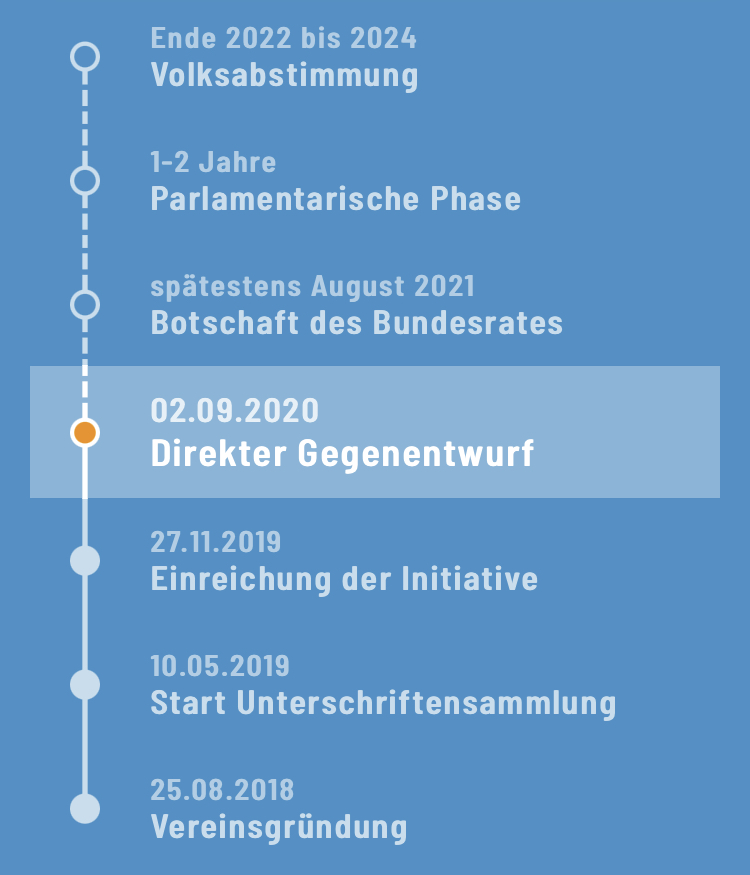 After having reached the necessary 100'000 votes, the initiative had been sent to the Federal Counsil on the 27th of November 2019.