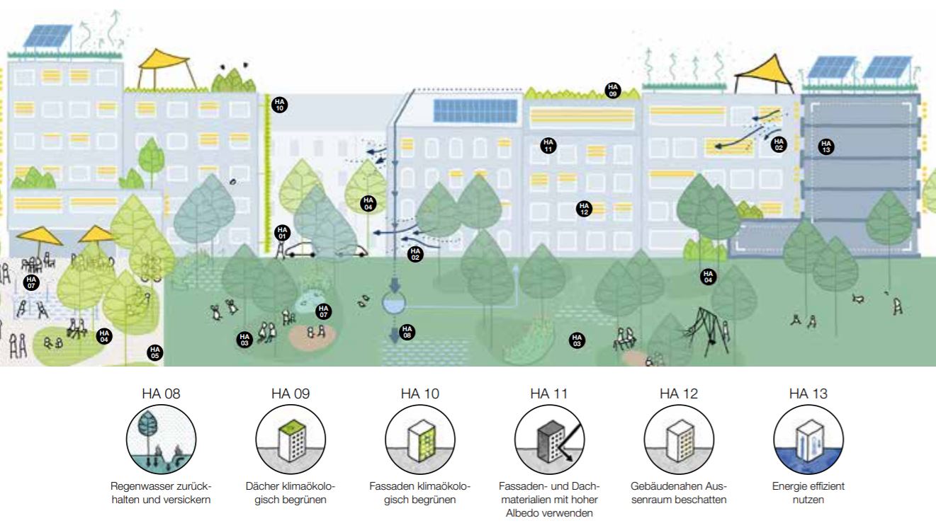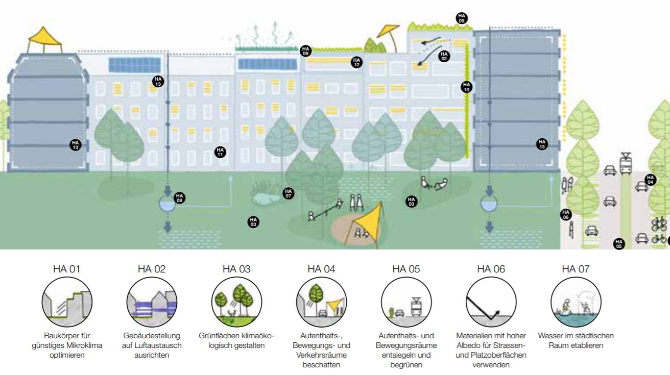 City planning today has several mitigation strategies (Strategien zur Klimaanpassung) like green planning (trees, green roofs, fronts, etc.), measures to change local wind patterns, alternative building materials, water dispensers and many others. Sensors and data collection can help check the effectiveness of the measures.