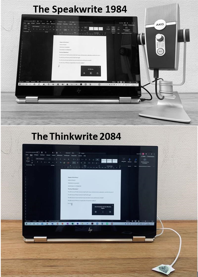 In George Orwell's bestselling novel of a futuristic society, 1984, a speakwirte was an instrument which could transfer spoken language directly into text. A speakwrite from 1984 can be compared to modern day speech recognition software. In 1997, 49 years after the novel was published, the first commercial speech recognition programs appeared on the market. Sadly, they were not as efficient and easy to use as would like. Now almost 25 years after the first programs for dictating texts came onto the market and flopped, are those programs now delivering enough quality and convenience to be using them in everyday life. But what about in 63 years? In the year 2084, which is 63 years from now, it would mark a 100-year difference to the novel’s version of 1984. Would our dictation machines finally work so flawlessly as the did in George Orwell’s version of 1984? Or would they even excel our expectations. As George Orwell would call it, would a “thinkwrite” machine be possible? A machine that would just transfer your thoughts into text…no need for voice recognition software.