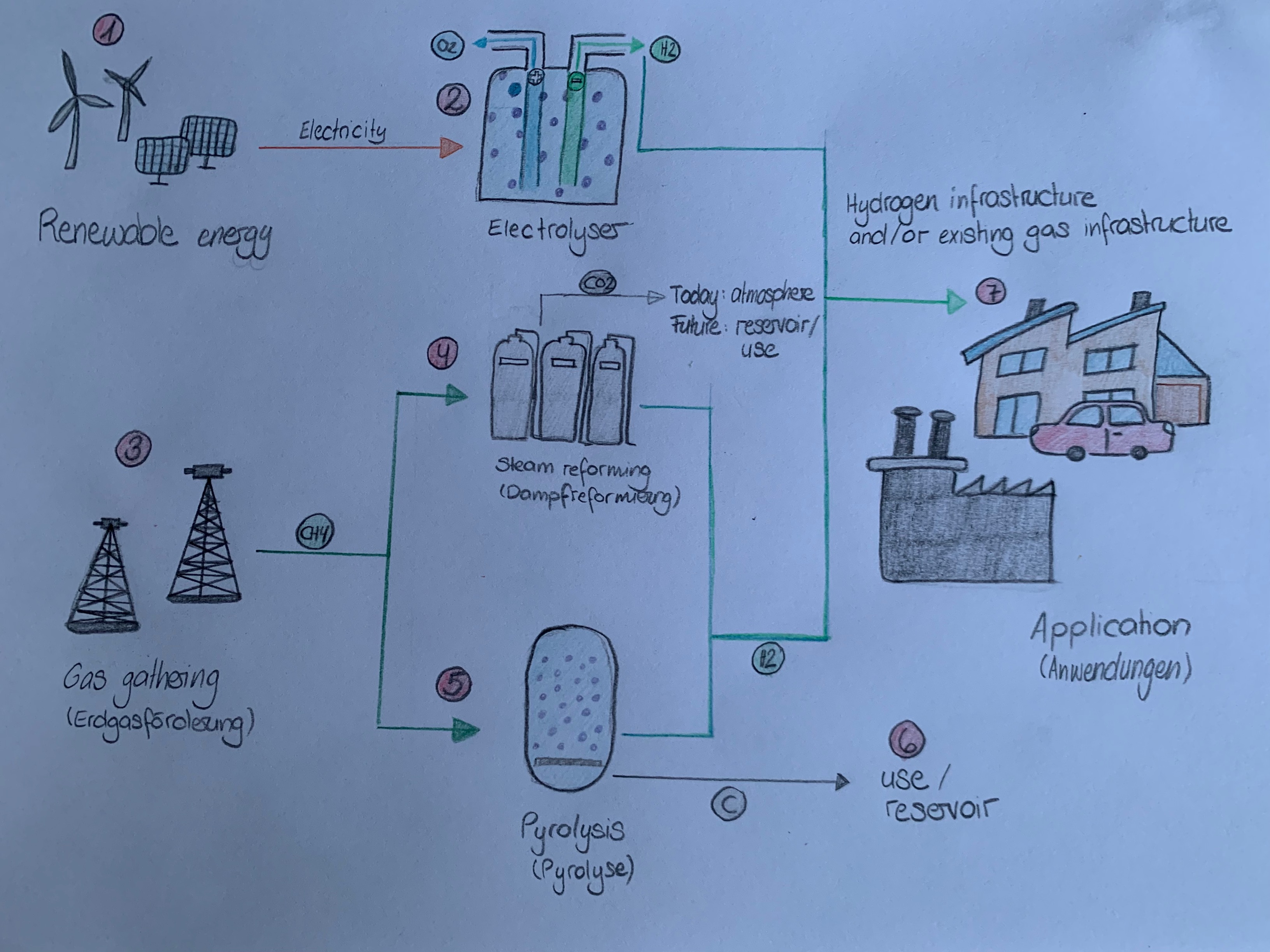 - The so-called blue hydrogen is obtained from petroleum gas (Erdgas) (CH4). There are also several processes for this, for example pyrolysis (Pyrolyse) or steam reforming (Dampfreformierung).